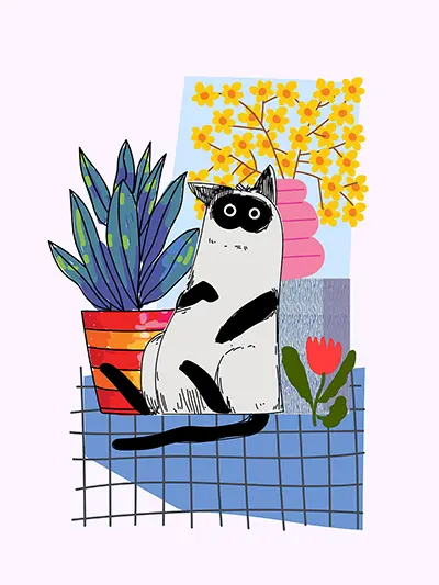 猫 宠物 植物 花 花盆 网格 插画 文艺